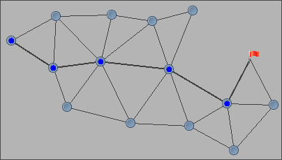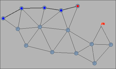 This algorithm is illustrated below, for a given source node (leftmost) and a target node on the right side (red flag).